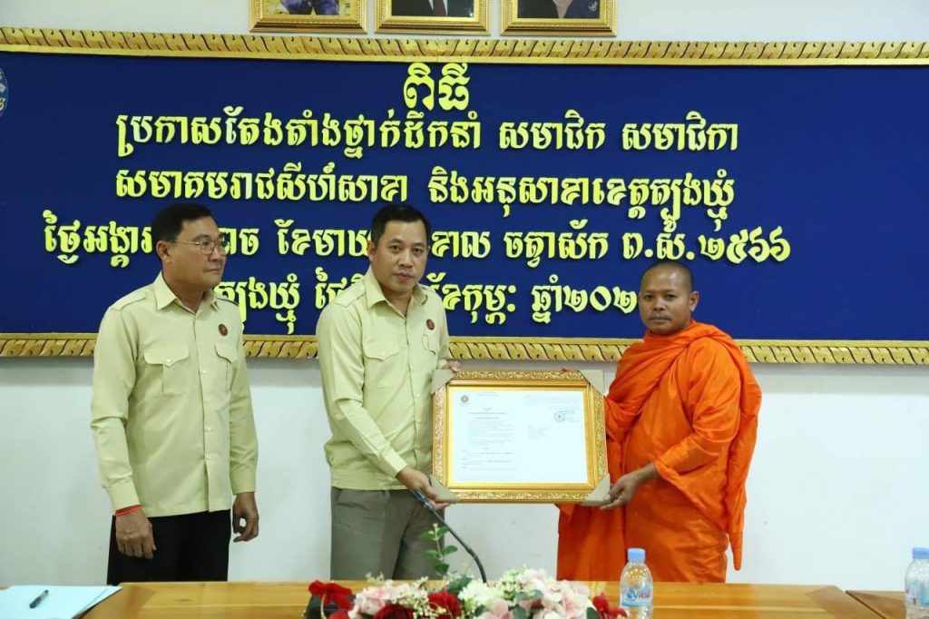 ឯកឧត្តម អ៊ុង សារ៉ាវ៉ាន់ អនុប្រធានអចិន្ត្រៃយ៍សមាគមរាជសីហ៍ បានអានសេចក្តីសម្រេចតែងតាំងថ្នាក់ដឹកនាំ និងសមាជិក សមាជិកា សមាគមរាជសីហ៍សាខាខេត្តត្បូងឃ្មុំ ដែលមាន លោក ធី ម៉ានី ជាប្រធានសមាគមរាជសីហ៍សាខាខេត្តត្បូងឃ្មុំ និង លោក កេង ប៊ុនណា ជាប្រធានកិត្តិយស ព្រមទាំងថ្នាក់ដឹកនាំ និងសមាជិក សមាជិកា សមាគមរាជសីហ៍សាខាខេត្តត្បូងឃ្មុំ ៣១៤អង្គ/នាក់។