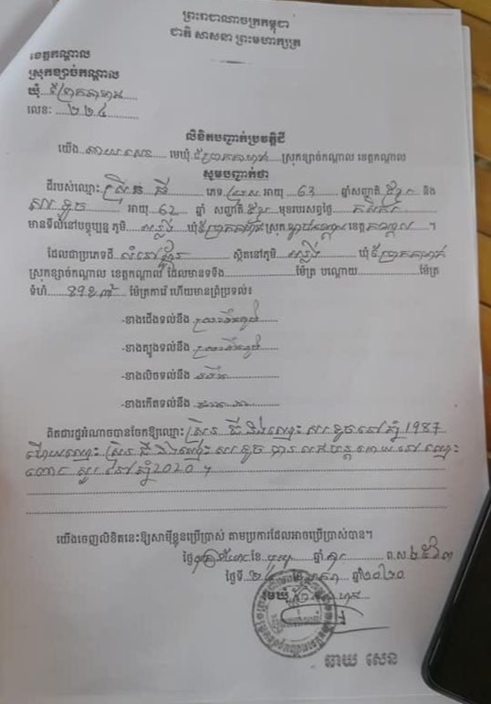 ២-ខ្ញុំបាទបានទិញដីពីឈ្មោះ ប៉ិច លាងសេង និងឈ្មោះ ឡោ ស្រីនាង មានព្រំជាប់គ្នាមានទំហំ (2190) ម៉ែត្រក្រឡា ដោយទីតាំងដីនេះជាប់ និងខ្ទមអ្នកតាស្ងួនជាប់នៅមាត់ត្រពាំងភូមិបឹងក្រចាប់ជើងដីនេះជាអំណោយរបស់រដ្ឋតាំងពីឆ្នាំ1987មកម្លេះ។ ក្រោយពីបានធ្វើលិខិតនិងកិច្ចសន្យាទិញលក់ផ្ទេសិទ្ធិមកខ្ញុំបាទស្រាប់តែលោក គ្រុយ ឈាងលីន ដែលជាមេភូមិបឹងក្រចាប់ជើង លោកបានបបួលខ្ញុំដូរដីដែលខ្ញុំបានទិញពី ប៉ិច លាងសេង និងដី ឡោ ស្រីនាង ជាមួយដីរួមភូមិបឹងក្រចាប់ជើងដែលមានព្រំជាប់ដីខ្ញុំបាទ ដែលទិញពីលោក ស្រុិន ធី គឺដូរទំហំប៉ុនគ្នា (2190) ម៉ែត្រក្រឡា និងទំហំ (2190) ម៉ែត្រក្រឡា ដោយលោក គ្រុយ ឈាងលីន មេភូមិបឹងក្រចាប់ជើងគាត់បានប្រជុំប្រជាជនក្នុងភូមិបឹងក្រចាប់ជើងមួយចំនួននិងក្រុមការងារអភិវឌ្ឍន៍ភូមិមុនពេលដោះដូរ (មានស្នាមមេដៃ) ការដោះដូរនេះ គឺមានផលចំណេញទាំងអស់គ្នា ដែលខ្ញុំបាទបានដីជាប់ព្រំគ្នាជាផ្ទៃដីតែមួយ ដែលខ្ញុំបានទិញពីឈ្មោះ ស្រ៉ិន ធី។